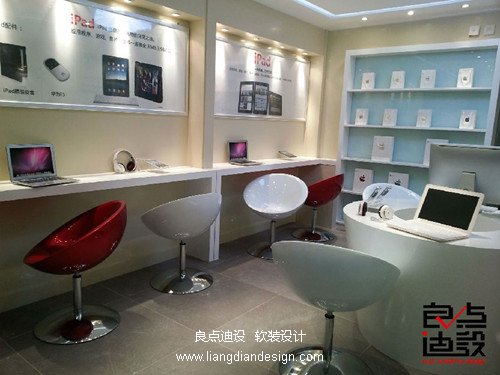 本Apple專營店背景色是地面的灰色和墻面的白色,配以原木色和亮銀色家具,點綴上高貴的具有科技感的炫色個性座椅,整個空間色彩搭配明快高調,凸顯Apple高級、尊貴與時尚。
