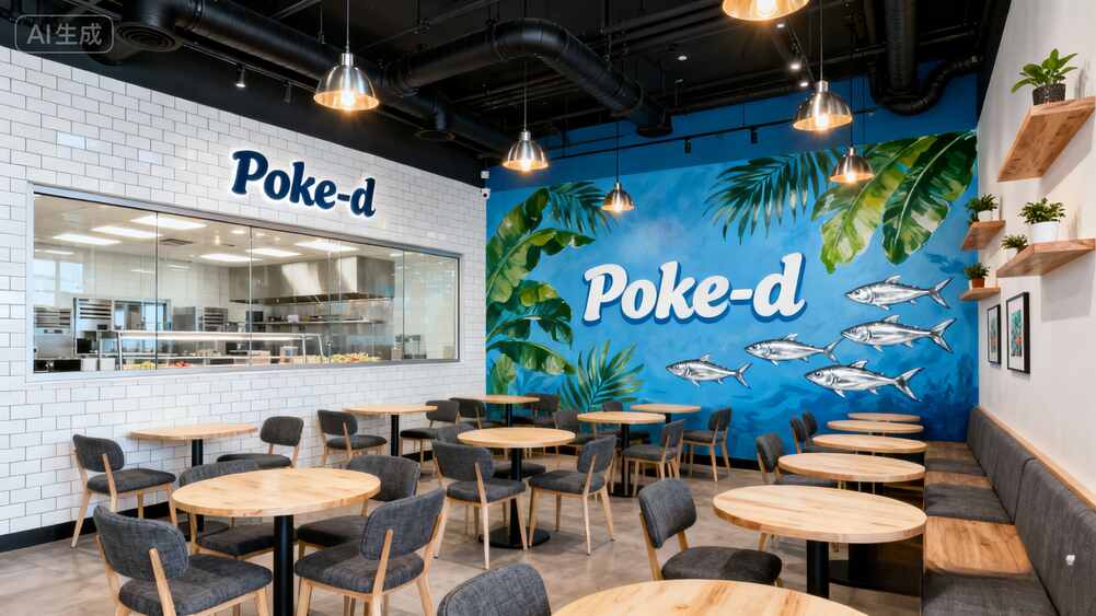 寶子們!今天要安利這家讓我一進門就驚叫的Poké-doke餐廳!整面墻直接把海底世界搬來了——藍色海浪里游著五彩魚兒,"Poké-doke"的立體字母像是從海里浮出來的,搭配綠植點綴,度假感瞬間拉滿!