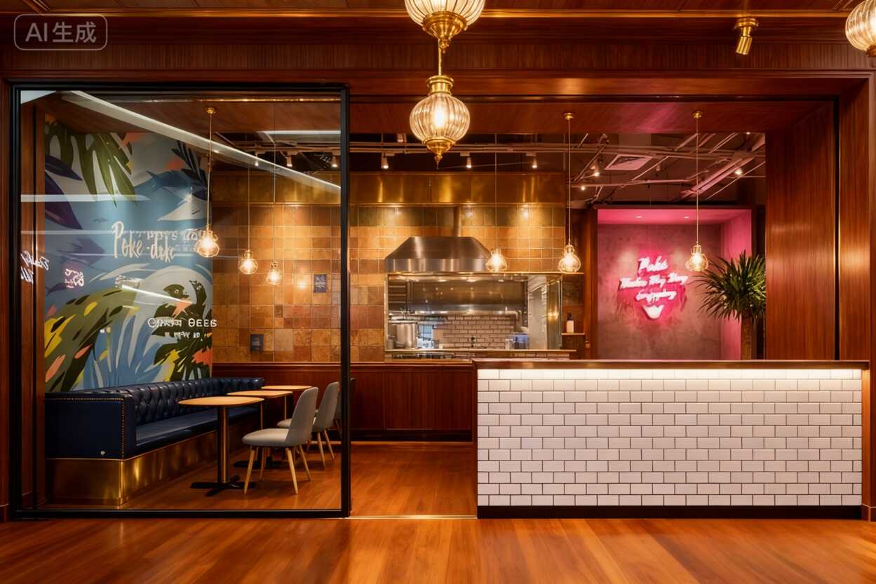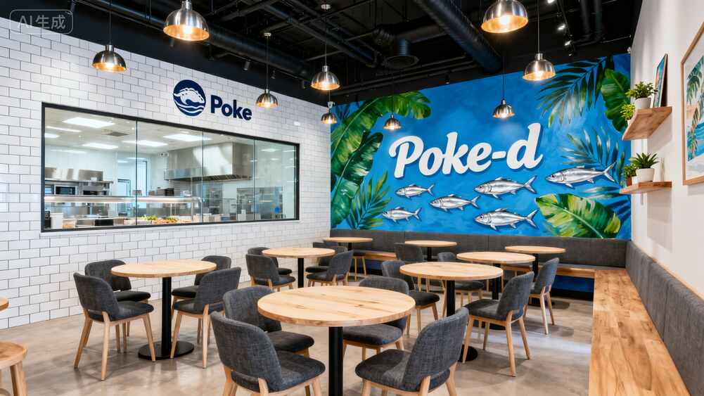 “Poke-d”的logo用簡約白色字母掛在墻上,底下一條大魚從字母間游過,配上翠綠棕櫚葉和波紋線條,瞬間把空間打開了好幾個層次。關鍵是這種壁畫成本比硬裝改造低多了,但效果***震撼——顧客進門***眼就被抓住,手機不自覺就舉起來拍照了!
