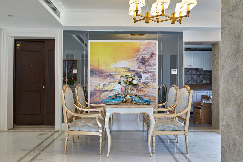 告別城市喧囂,剛從國外出差回來女主人就飛似的回到千般思念的家,脫下高跟鞋換上舒適優雅的絲綢刺繡家居拖鞋,玄關處是她精心挑選的白色描金玄關柜,墻上懸掛著一幅她在法國小畫廊里淘回來的精致掛畫,兩邊的壁燈與精致的水晶吊燈相互呼應折射出七彩光芒,女主人將鑰匙放到小瓷盒里便向餐廳望去。