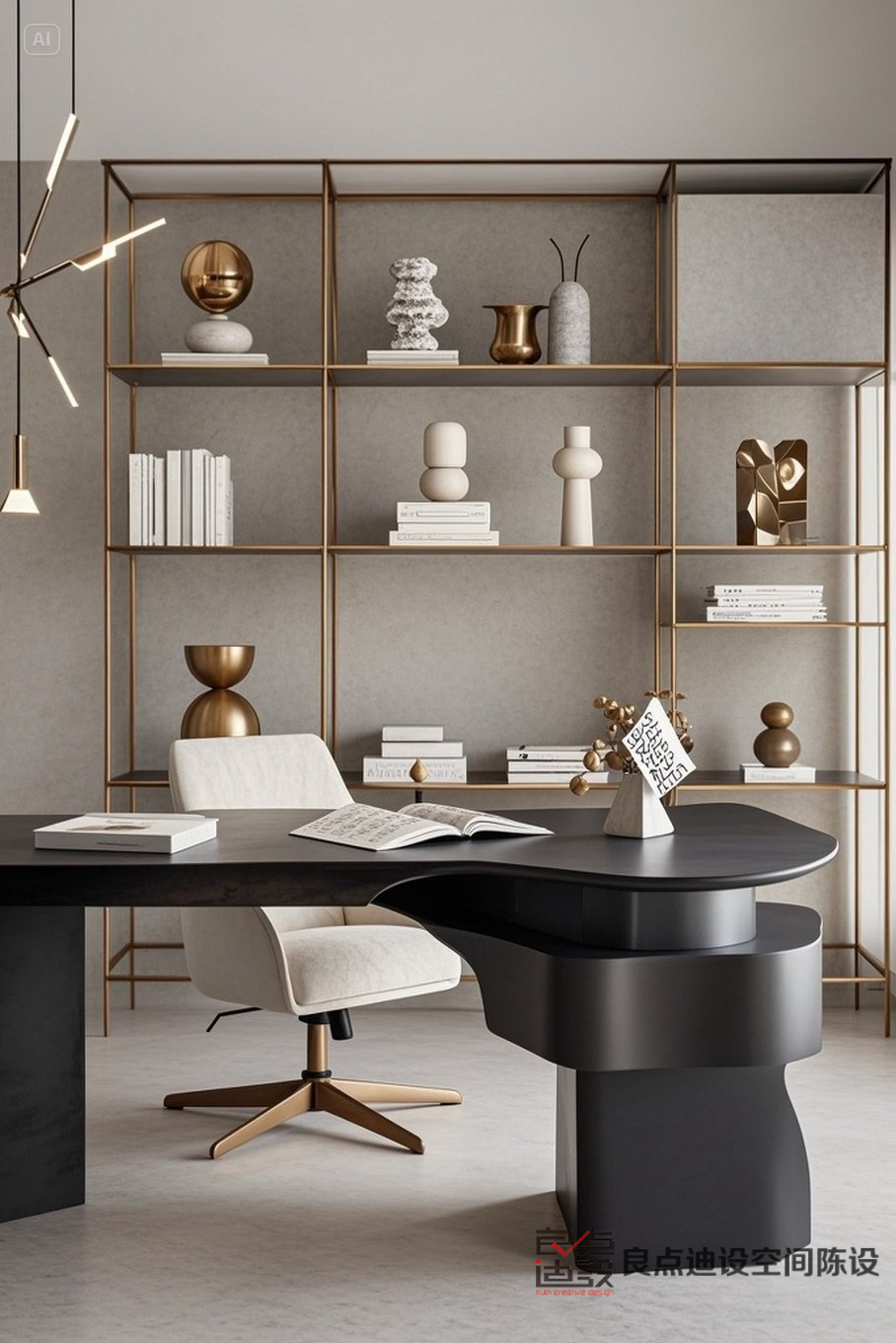 先看這張圖片,一整個高級住了有沒有~這書房的風格我愿稱之為現(xiàn)代簡約與輕奢的***融合。