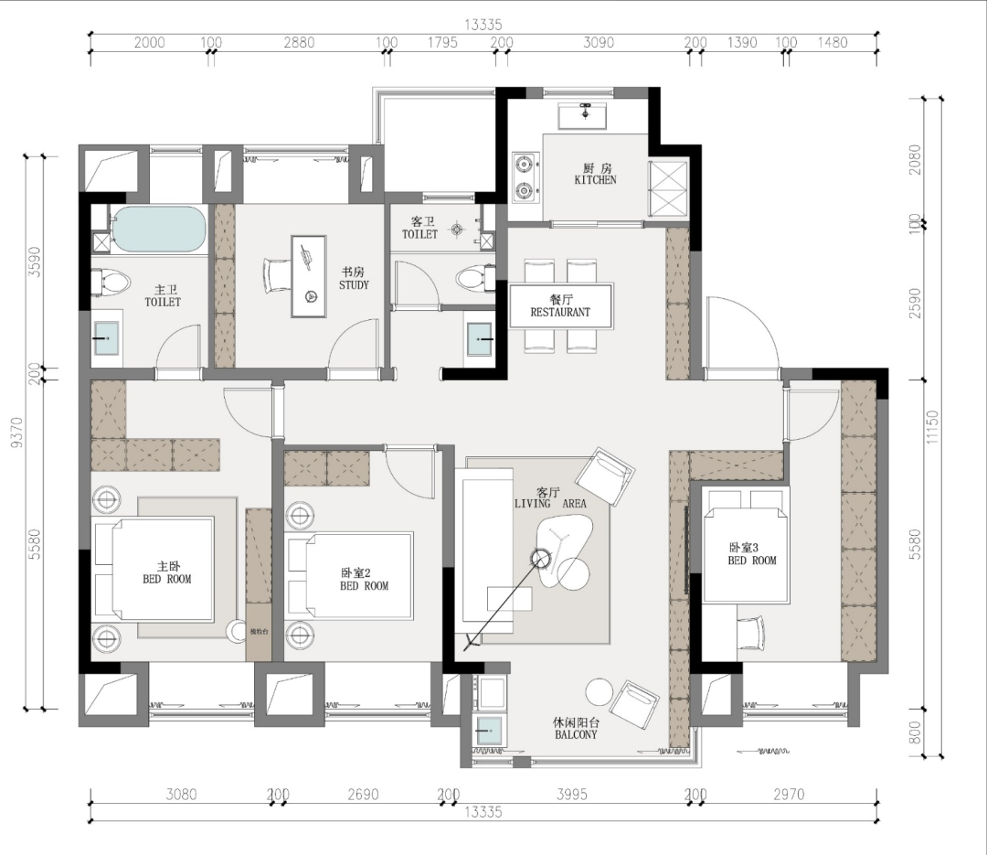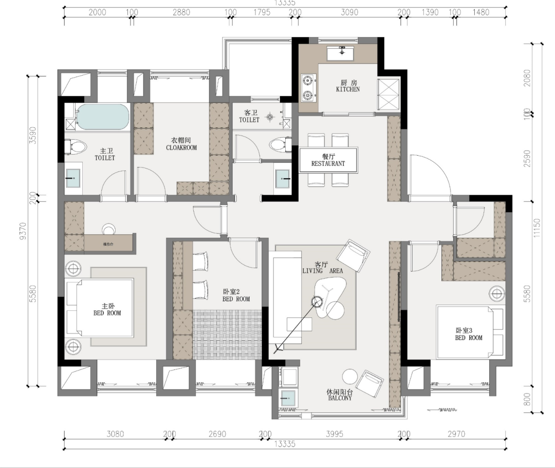 設計思路:陽臺打通,打造多功能陽臺。增加門廳換鞋柜和餐廳餐邊柜的儲物功能,保留獨立書房。臥室3增加儲物空間。