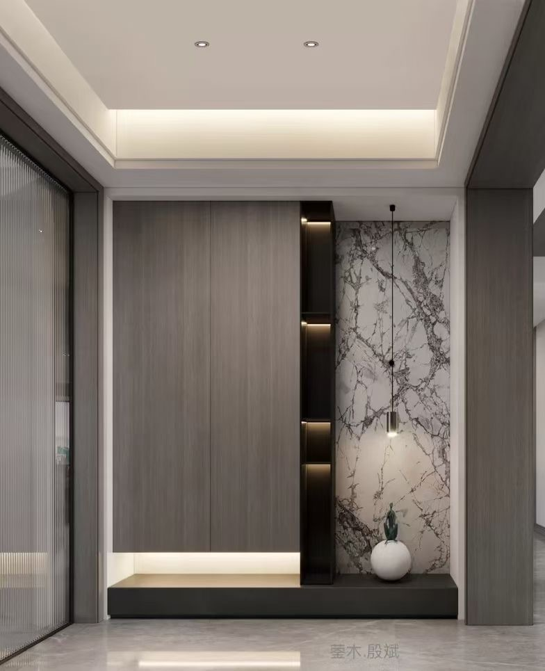 對于無玄關的戶型,入戶門左右側有較長的靠墻區域,且安置鞋柜后不會阻礙空間的利用,那么可以將鞋柜平行布局在門體的一側。柜子與門體位于同一方向,進門后的空間感依舊保持寬松舒適,又能實現較大面積的儲物收納空間,狹小的轉角區域亦可以得到合理利用。